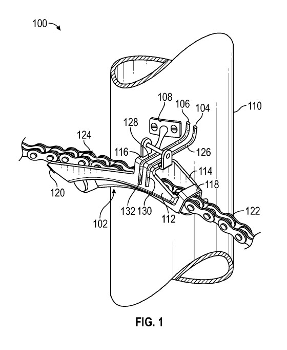 これらのワイヤーは、130と132でチェーンガイドに取り付けられている。