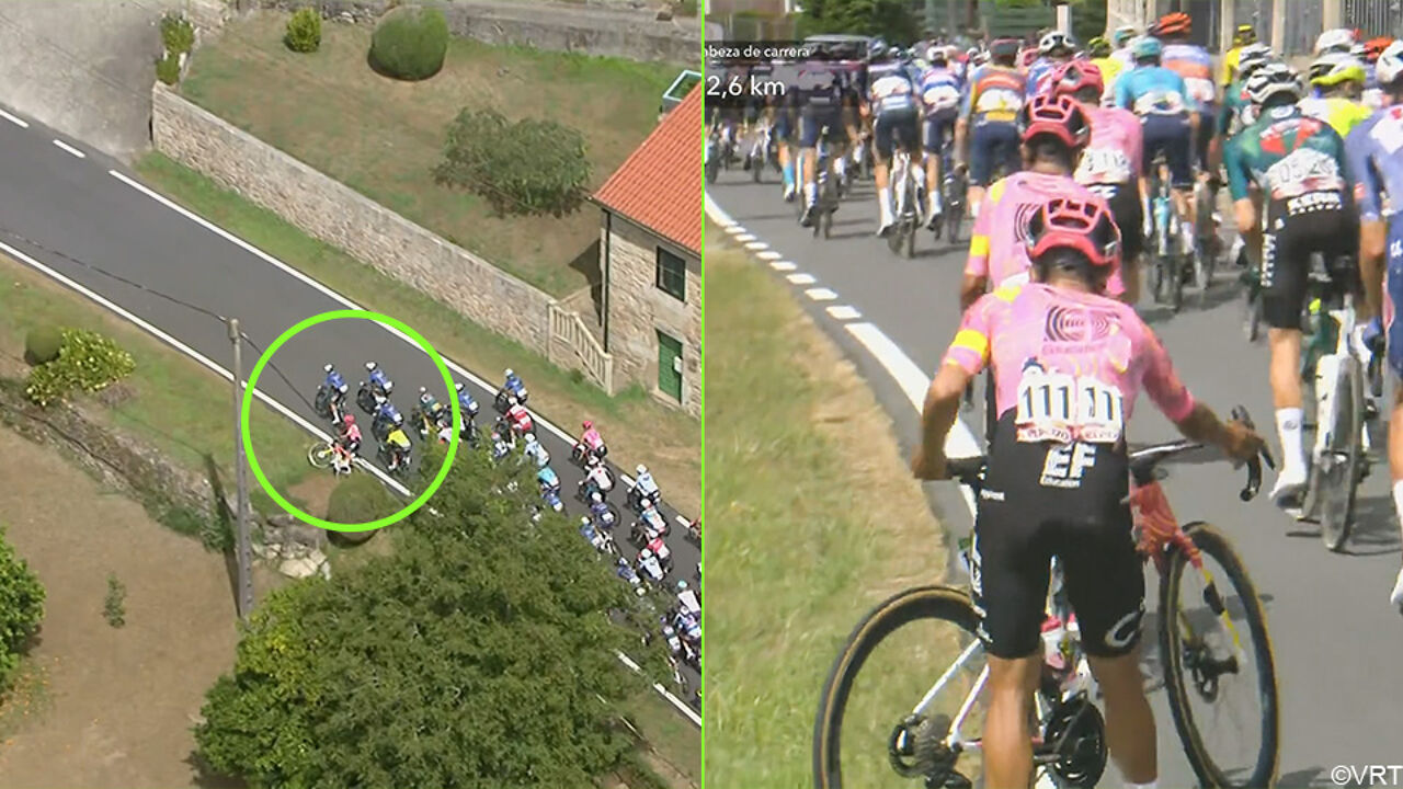 原因は、リチャル・カラパスが抜け出そうとするライダーに追従しようとした時に、Decathlon AG2R La Mondiale Teamのライダーに当たって落車したためだ。
