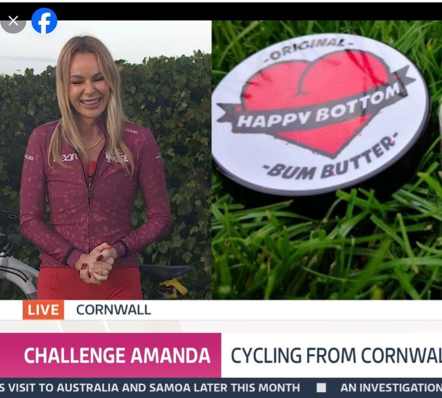 アマンダ・ホールデンはテレビインタビュー番組、グット・モーニング・ブリテンでチャリティーサイクリングとシャモアクリームのHappy Bottom Bum Butterを宣伝した。