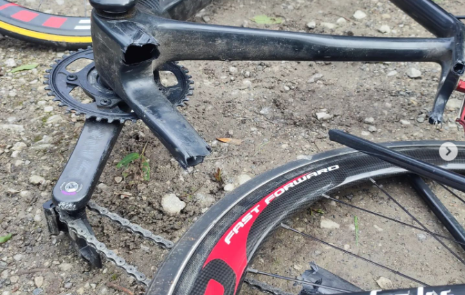 カラム・スコットソン氏は、2017年にもバンクロードヒルクライムでクランクセットを破壊している。Instagramの2枚目の写真だ。