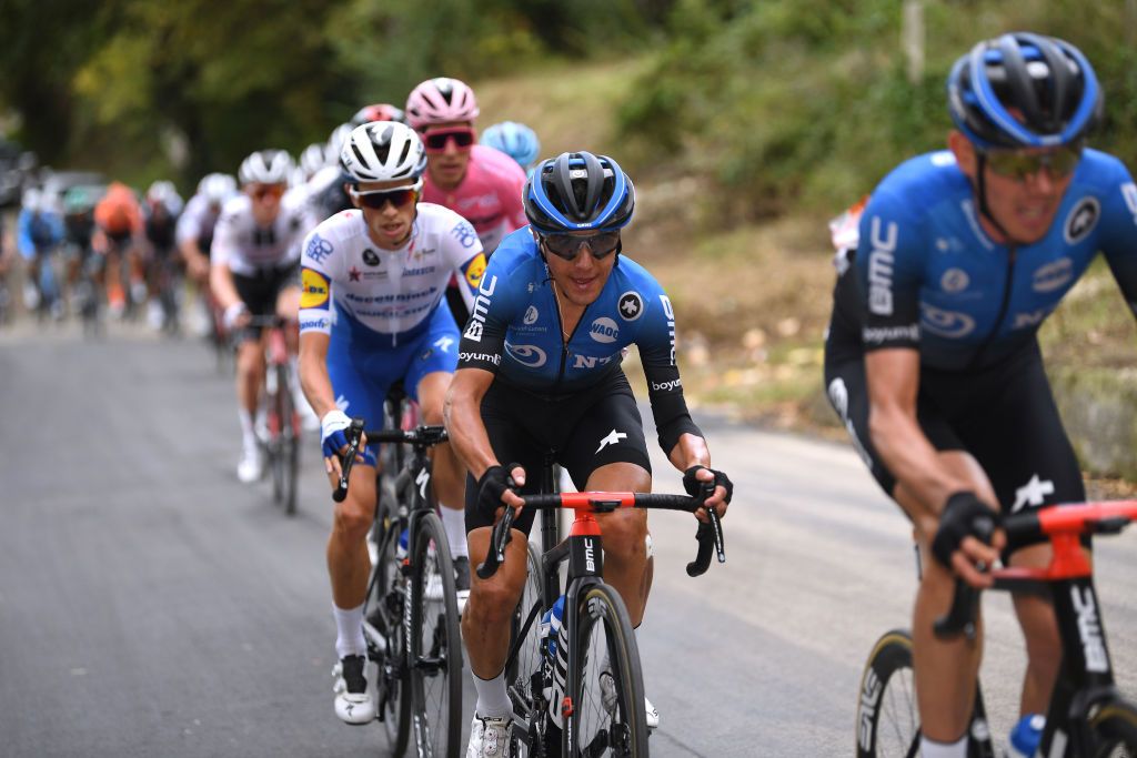 ドメニコ・ポッツォヴィーヴォは登りでバイク交換、ヤコブ・フルサンは下りでパンク。集団との距離が違ってくる。