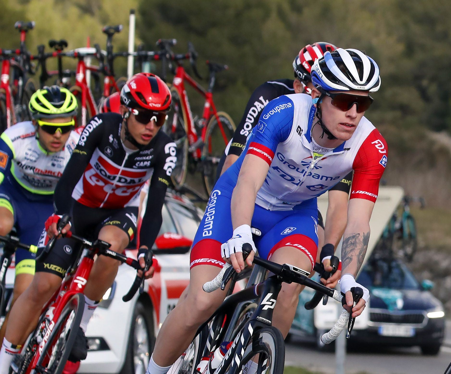 Groupama-FDJのジェイク・スチュワートは、フランスのワンデイレース、ショレ=ペイ・ド・ラ・ロワールのゴールでナセル・ブアニ(Team Arkéa Samsic)にフェンス際に追いこまれてブレーキをかけて落車を逃れた。