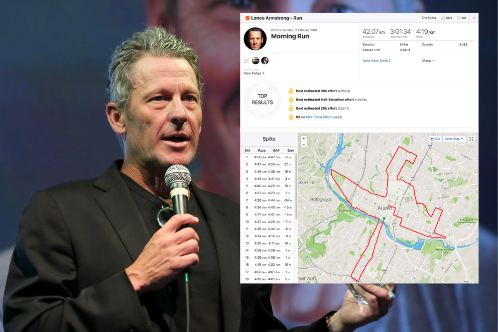 Armstrongは3:01:34でマラソンを走りきった。これに22分をプラスしたタイムで公式の記録となる。競技に参加した、マラソン、ハーフマラソン、5キロメートルのレースで2,652人のフィニッシャーのうち58位でフィニッシュしています。