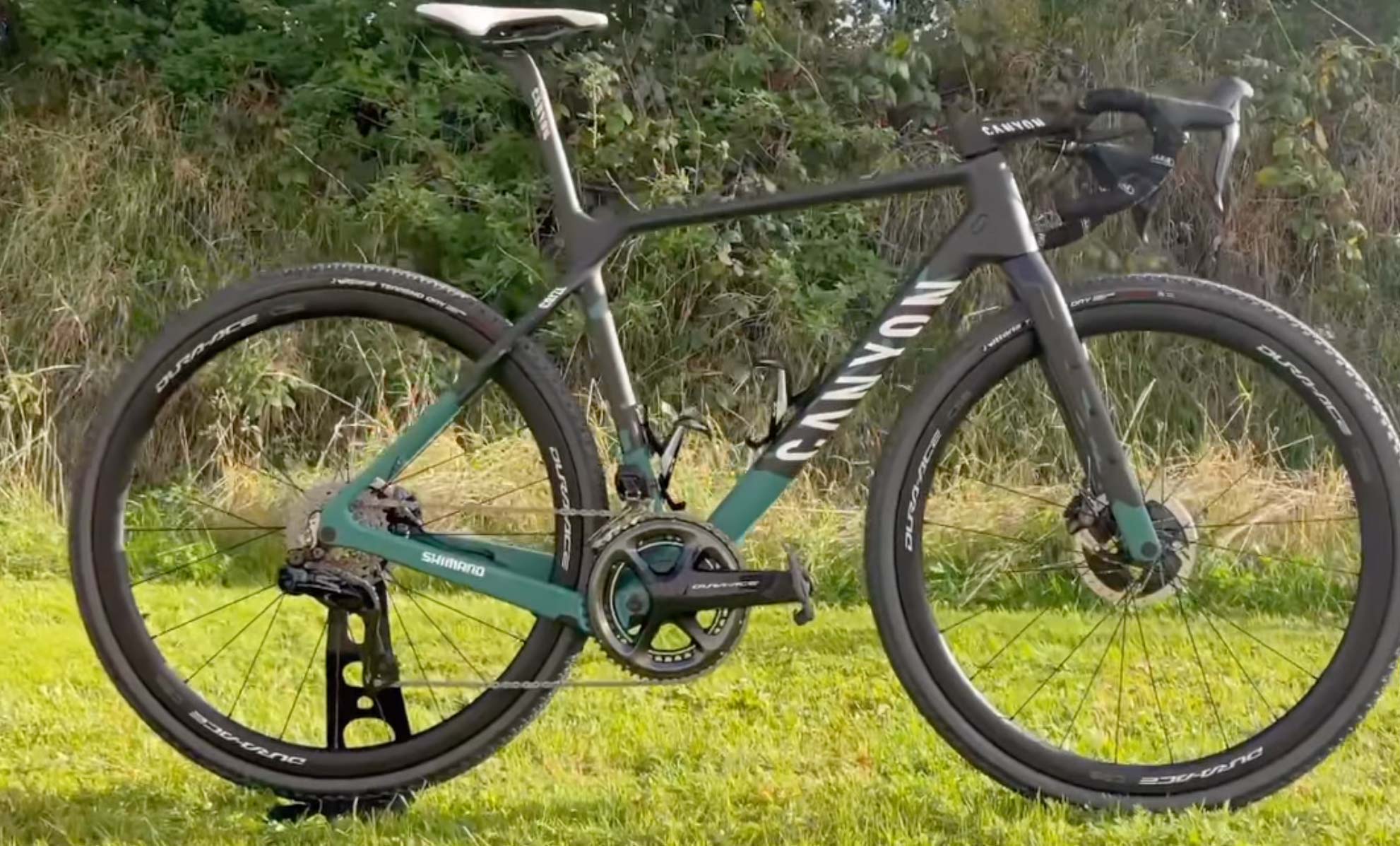 CANYONは2種類のグラベルバイクを製造している。スピード重視のGrail。まず、こちらはフレーム形状も少しエアロになっており、ハンドルはダブルデッカーバー。ロードでも走れることを目指している。