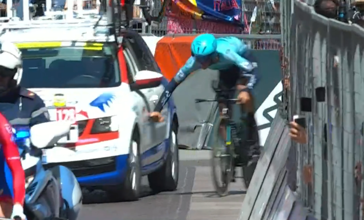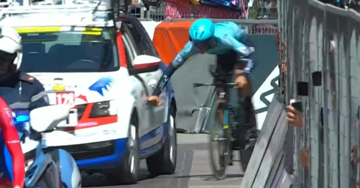 表彰台に向けて走っていたアスタナのマッテオ・ソブレロは、予期せぬアクシデントに見舞われてしまう。