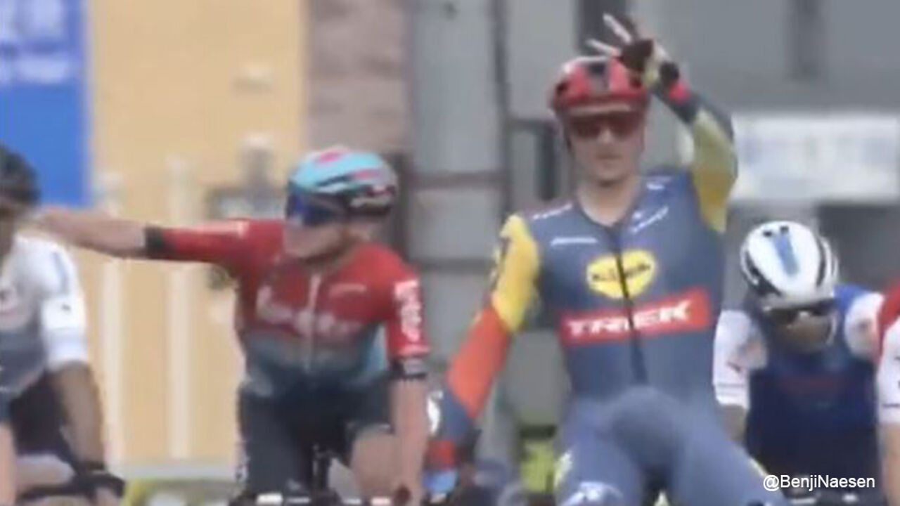 状況だけど、8位でゴールしたMatrix Powertagのゲオルギオス・バグラスは、Team Jayco AlUlaのフェリックス・エンゲルハントを押しのけようと、数秒前にハンドルバーから手をはなした。