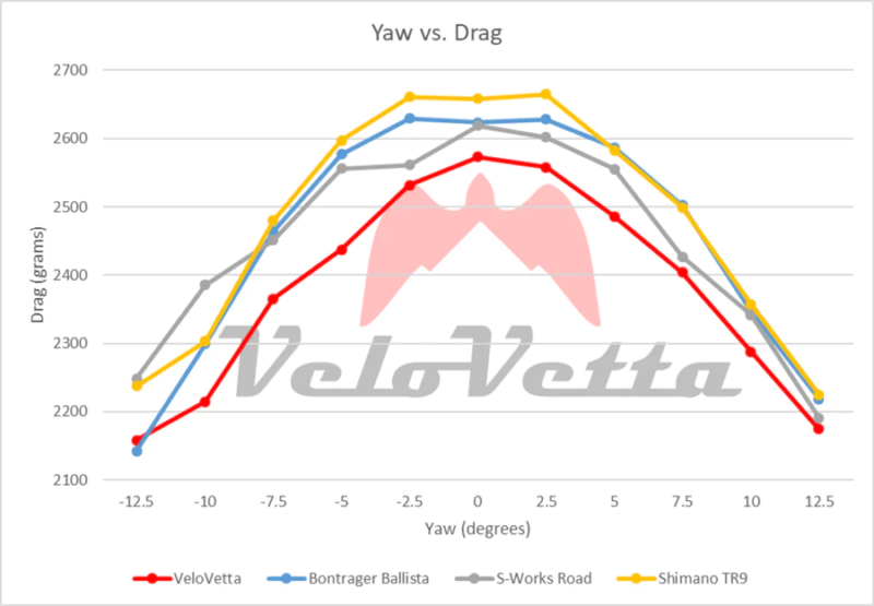 テスト結果から、VeloVetta プロトタイプは、ほぼすべてのヨー角にわたって抗力が最も低かった。