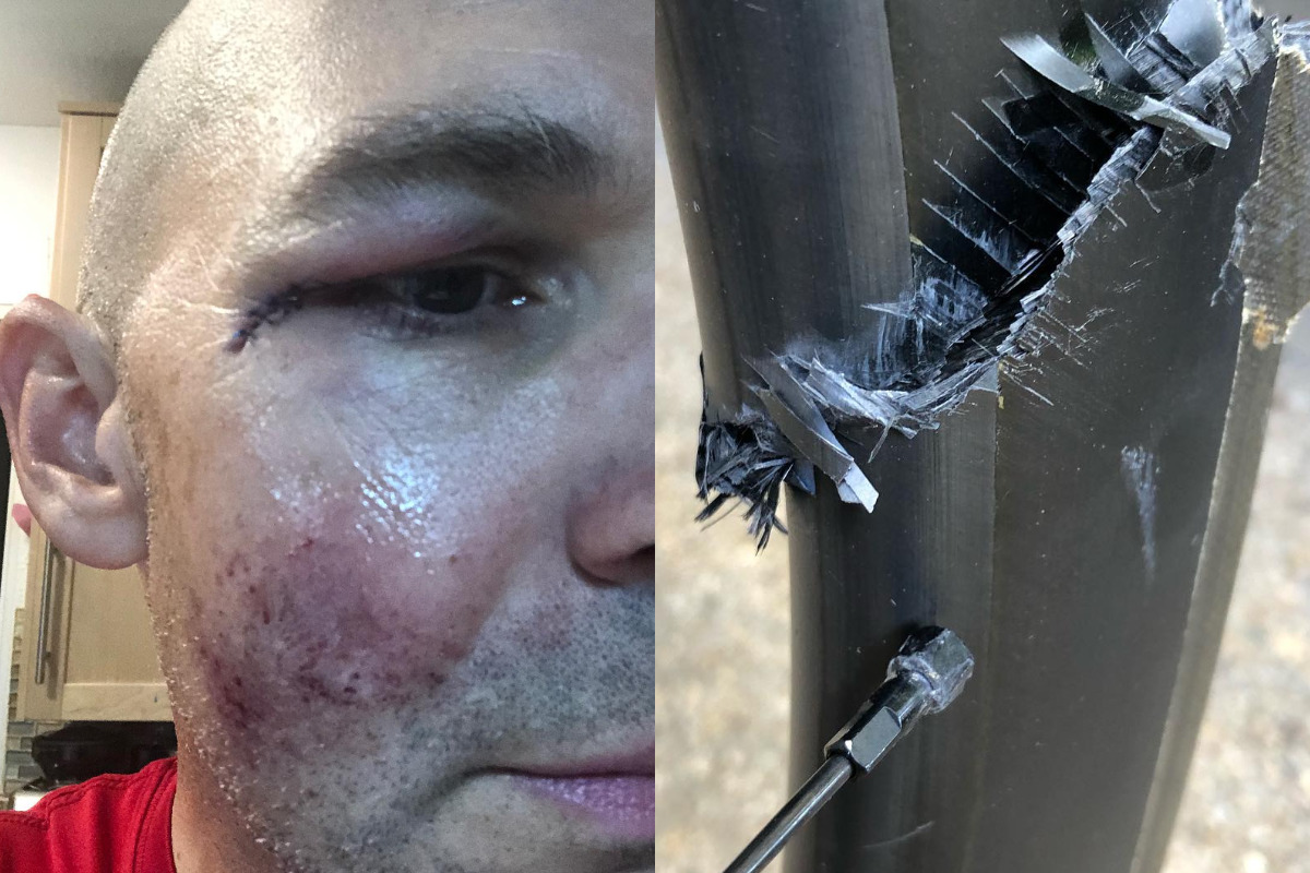 彼が、時速30マイル(50キロ)で走っている最中、なんの警告なしにカーボンホイールが破断。