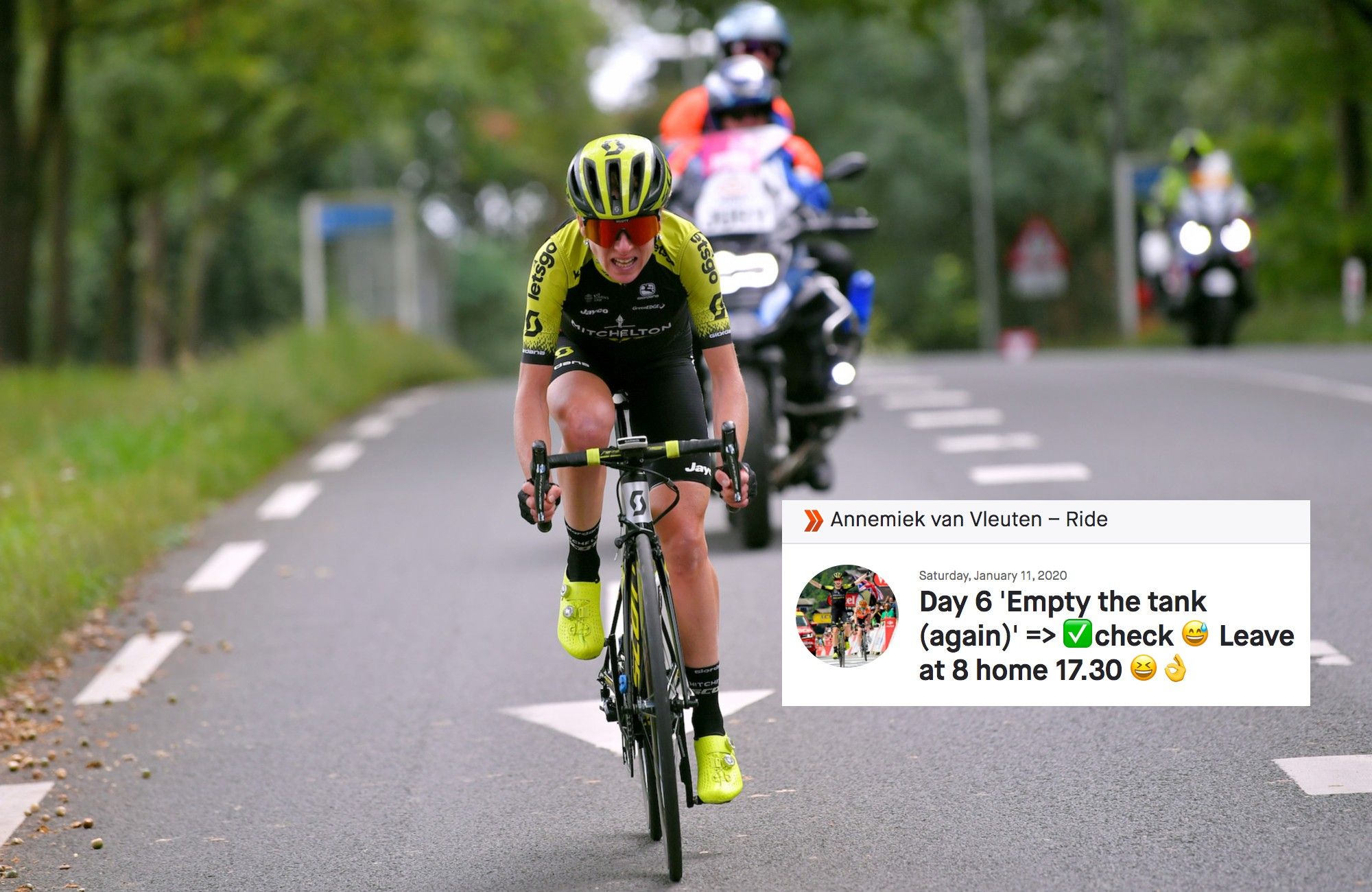チームメイトとグループライド出来ないニュージーランド出身のアアネミエク・ファンフルーテンは男性チームのキャンプに参加しているのだ。