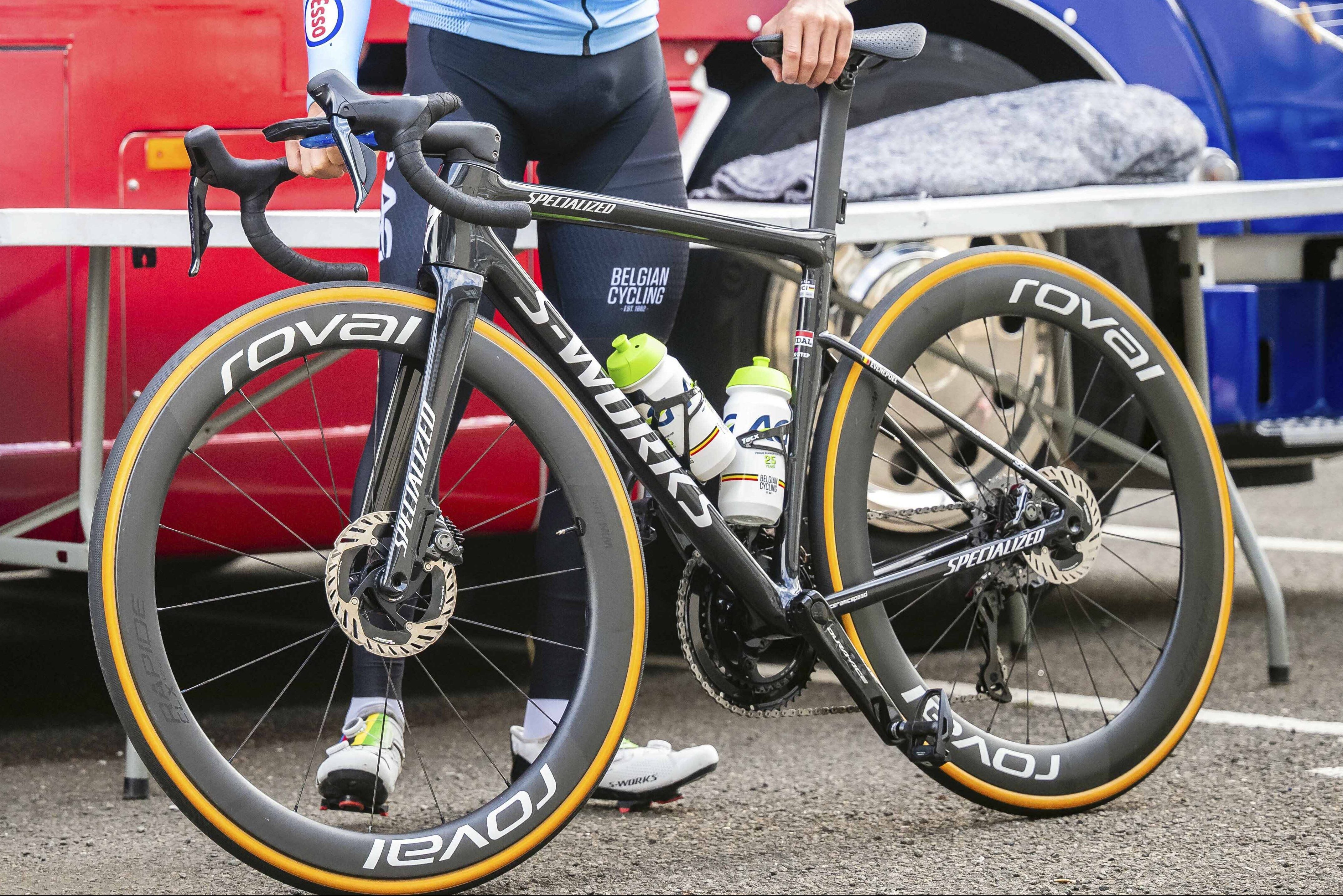 レムコ・エヴェネプールのRoval Rapide CLX II ホイールはチューブレス対応。しかし、インナー チューブ付きの古いクリンチャー S-Works Turbo Cotton タイヤを使用している。