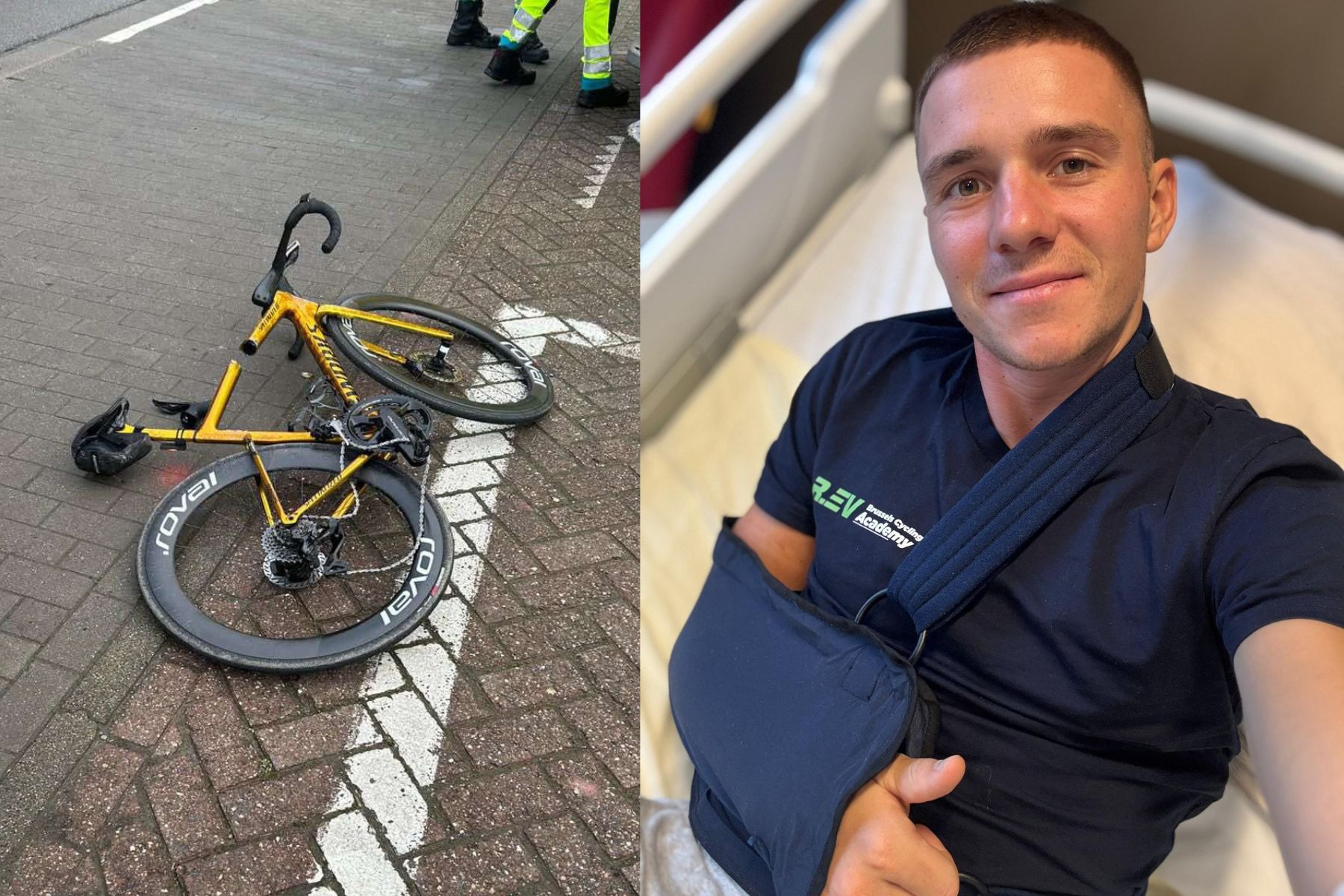 From the Remco Evenepoel crash place, Remco was unable to avoid an opening car door from the postal vehicle and the doctors said it can be broken shoulder and broken wrist.