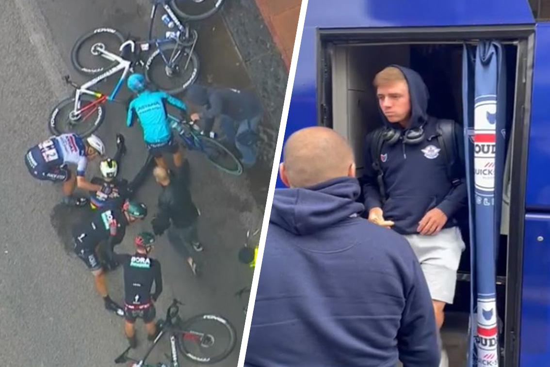 Soudal – Quick Stepのレムコ・エヴェネプールも2度の落車。最初の落車は犬がダヴィデ・バッレリーニにぶつかったためだった。
