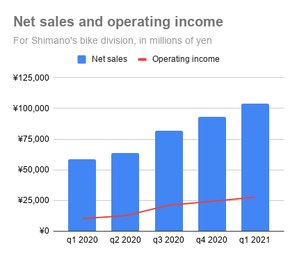 Shimanoの自転車部門の第1四半期の売上高は、昨年の同時期と比較して76.3%増加。当部門の営業利益は170%増加している。