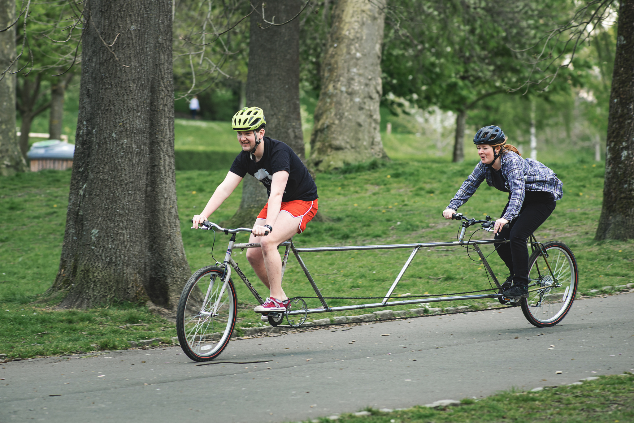 このタンデムバイクは、グラスゴーを拠点とするサイクリングチャリティーBike for Good に寄付されたスクラップのバイクから作られた。