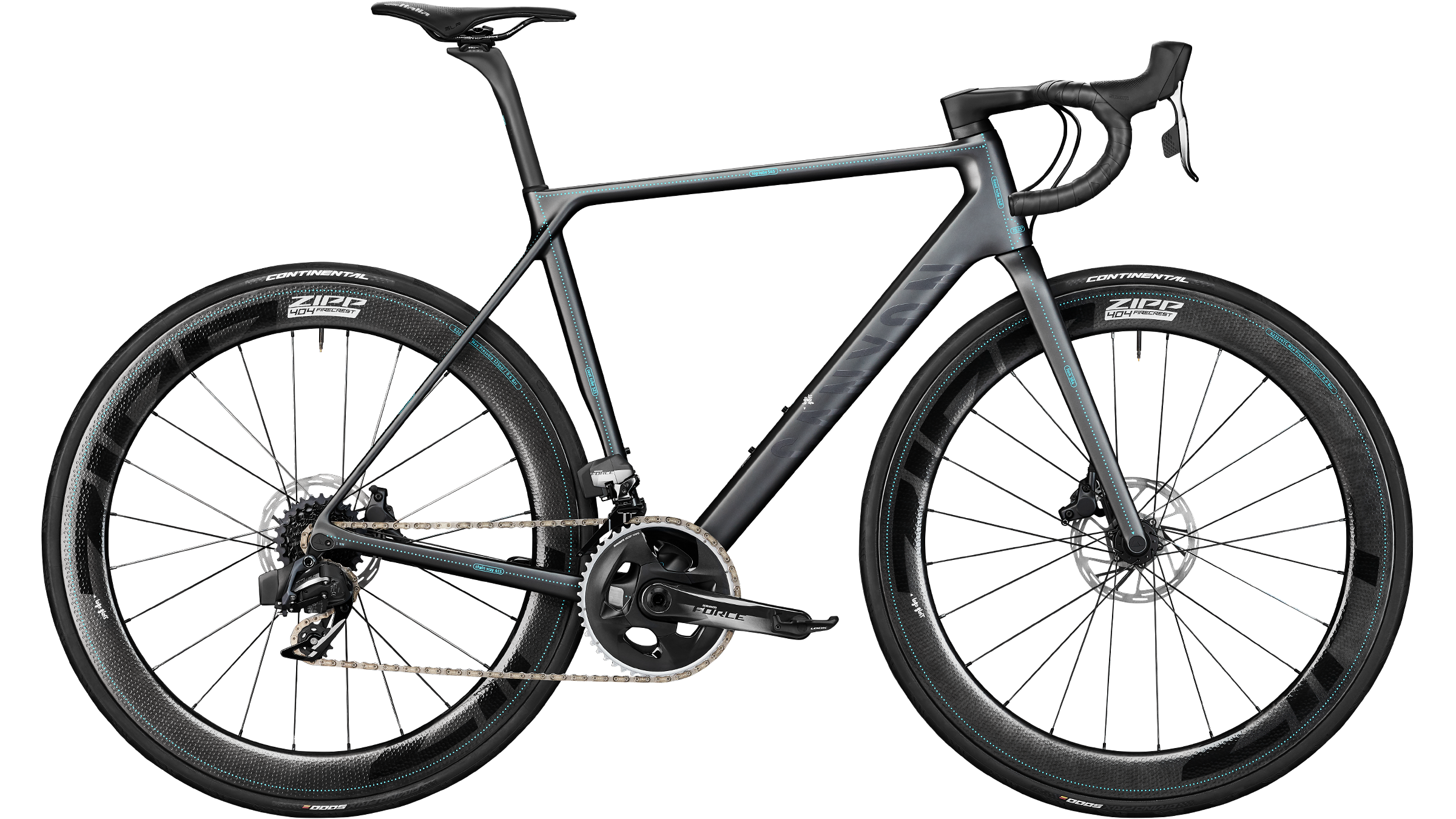 フレームは、SRAM Force Etap AXS グループセット、Canyon の CP10 一体型カーボンコックピット、Zipp 404 Firecrest ホイール、Continental GP5000 タイヤで構築されている。