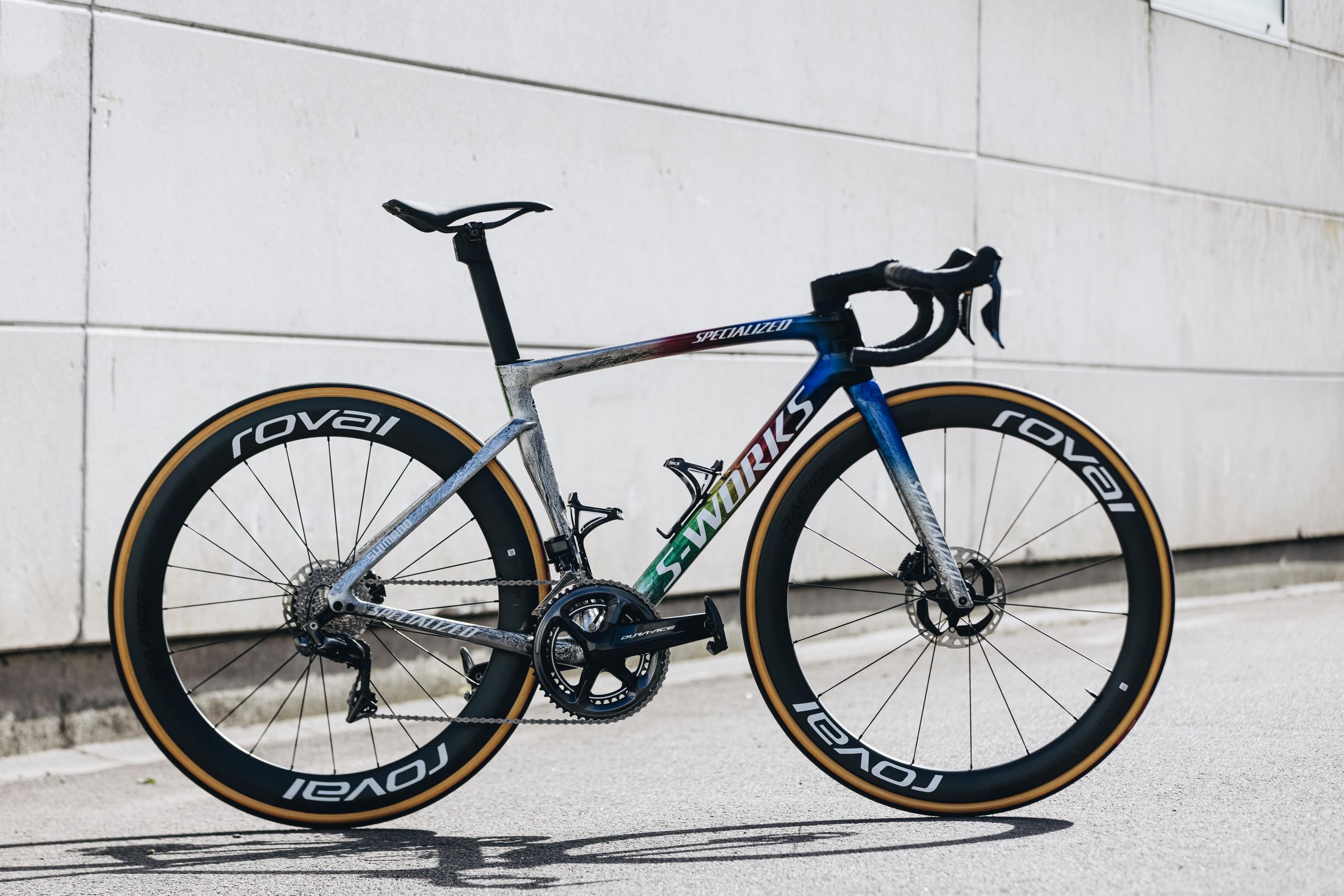 カスタムペイントが唯一の変更点で、ShimanoのDura-AceDi2グループセット、ホイールはRovalで、丘陵コース向けの軽量AlpinistCLXと、フラットなステージプロファイル向けのRapideCLXを使用。