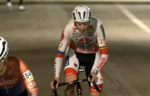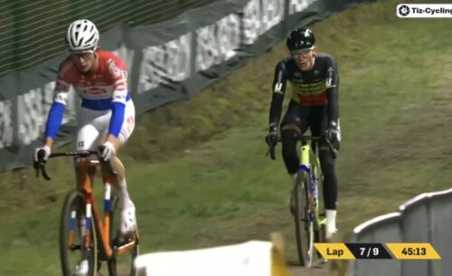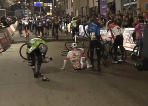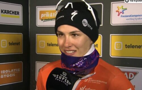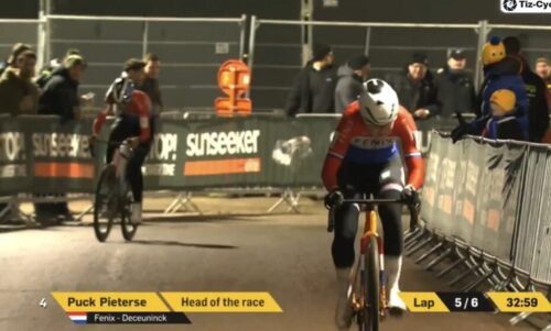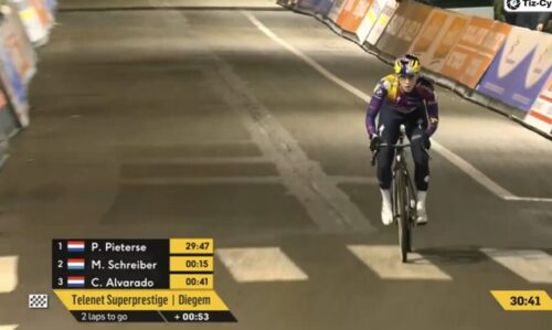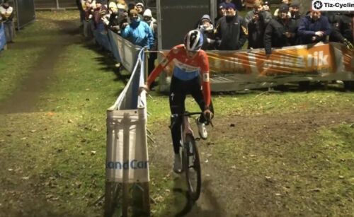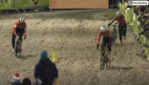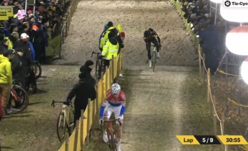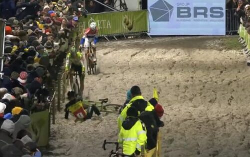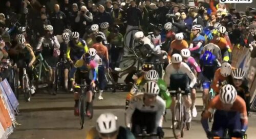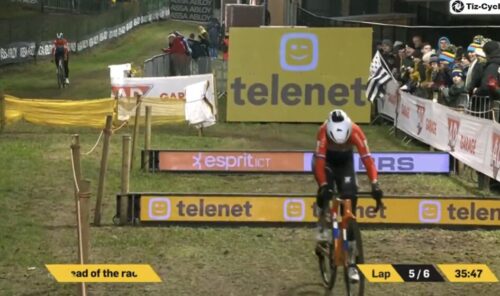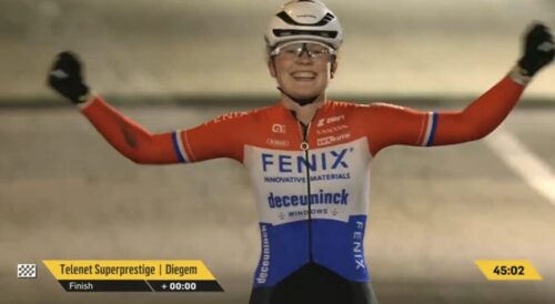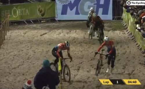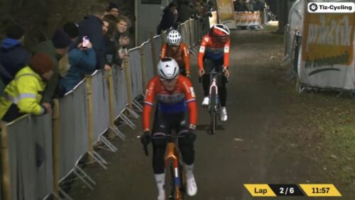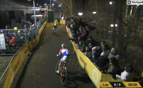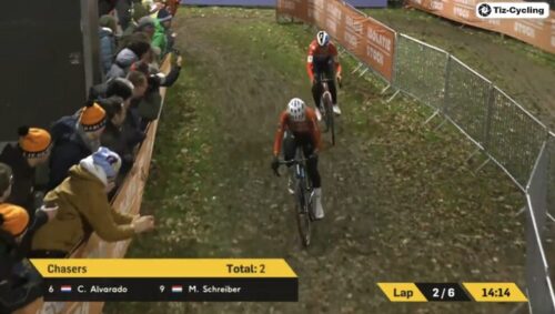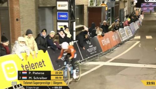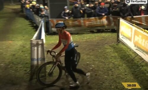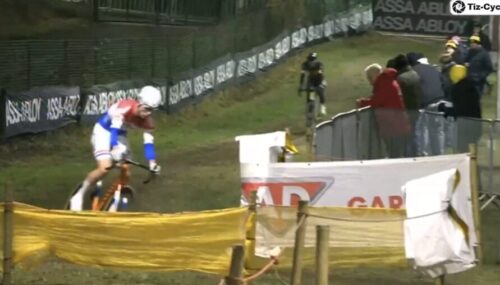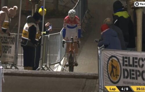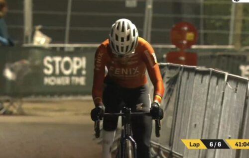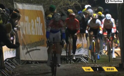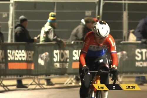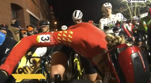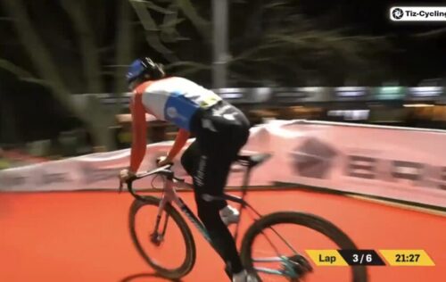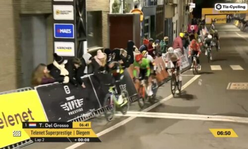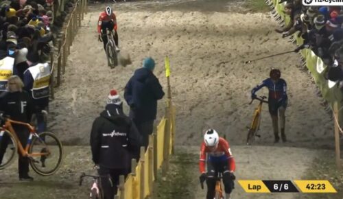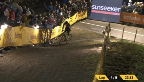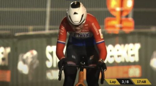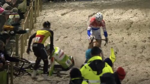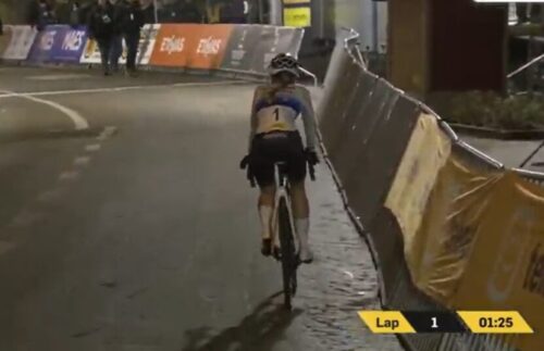 インゲ・ファンデルヘイデンが第1コーナーで落車。スーパープレスティージュの順位からも脱落しそう。身体も痛そうだ。のちにリタイヤが告げられた。
