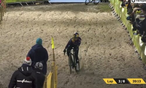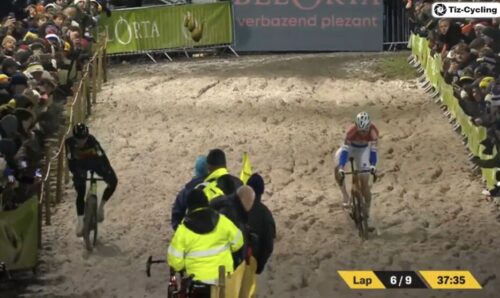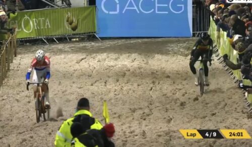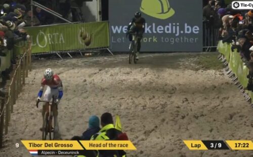 ティボール・デル・グロッソが再び3秒のリード。過去にサンドボックスでマチュー・ファンデルプールが抜け出してことがあるけど、同じ個所でティボール・デル・グロッソもアタックするかも。