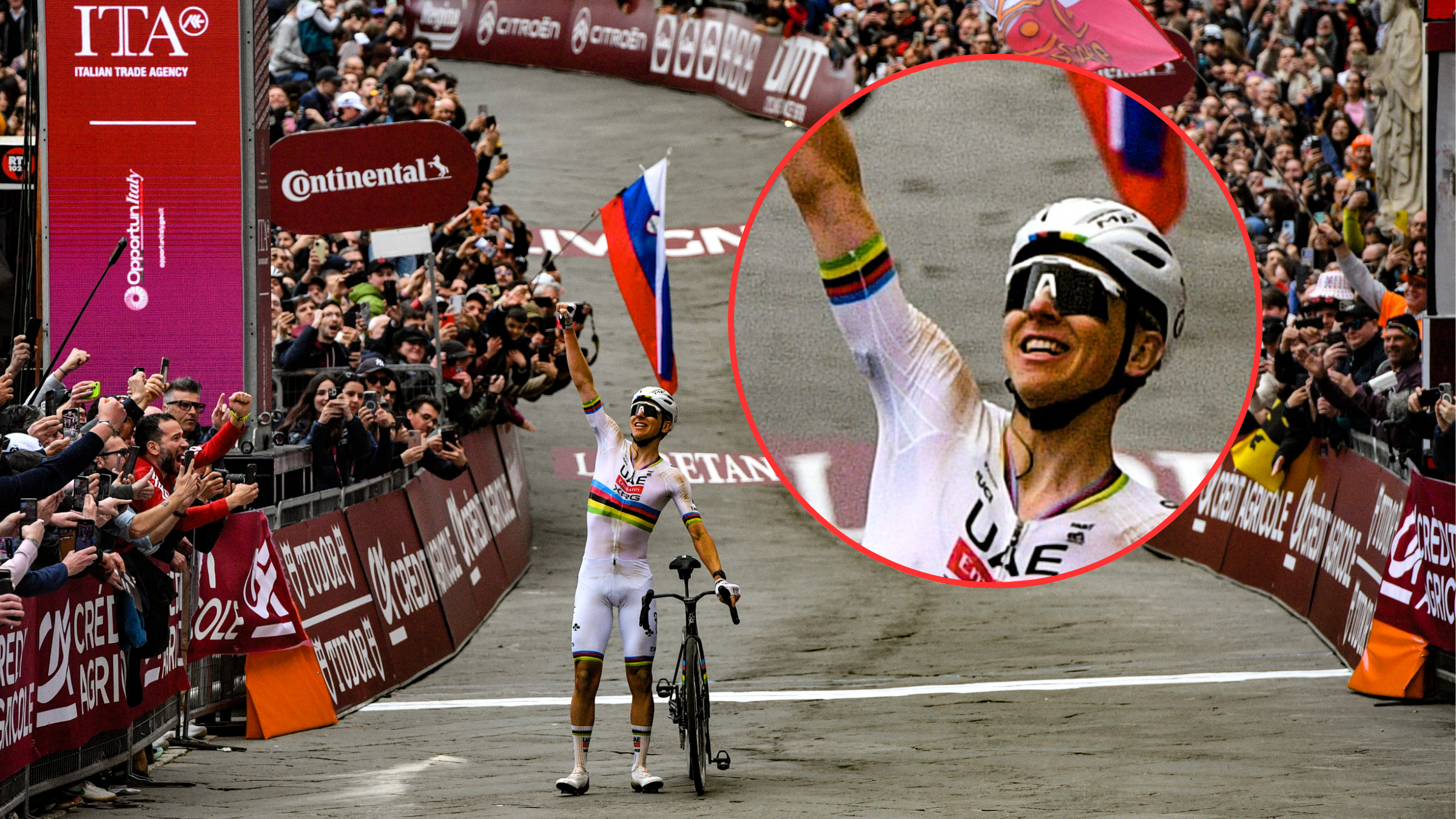 ストラーデ・ビアンケで勝利を収めたタデイ・ポガチャル(UAE Team Emirates – XRG)が右腕を上げた際、脇の下付近に「謎の黒い影」が見えたことでSNS上で大きな波紋が広がった。
