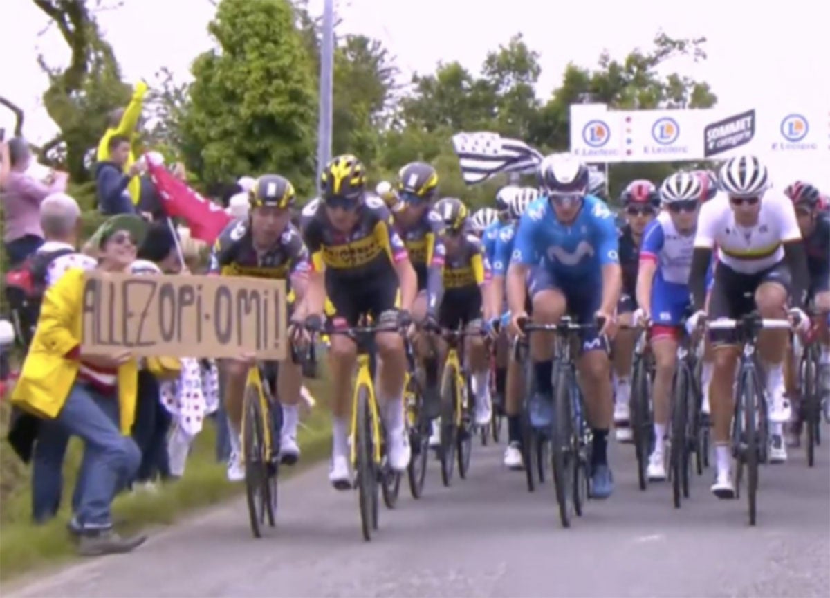 A spectator on the side of the road hit a cyclist during Tour De France 2021 #TDF2021 with a placard causing a massive crash. She wa trying to wave at the TV to greet her grandparents. The placard read “allez opi omi” which is French/German for Go grandpa-grandma. pic.twitter.com/oJtPXtzyTj