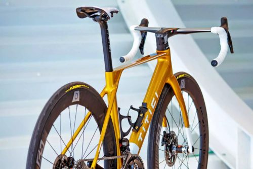 Titiciは1964年創業のバイクブランドで、ハンドメイドで作られている。このTitici F-RI02エアロロードバイクの特徴は、なんといっても板のように見えるトップチューブの形状。