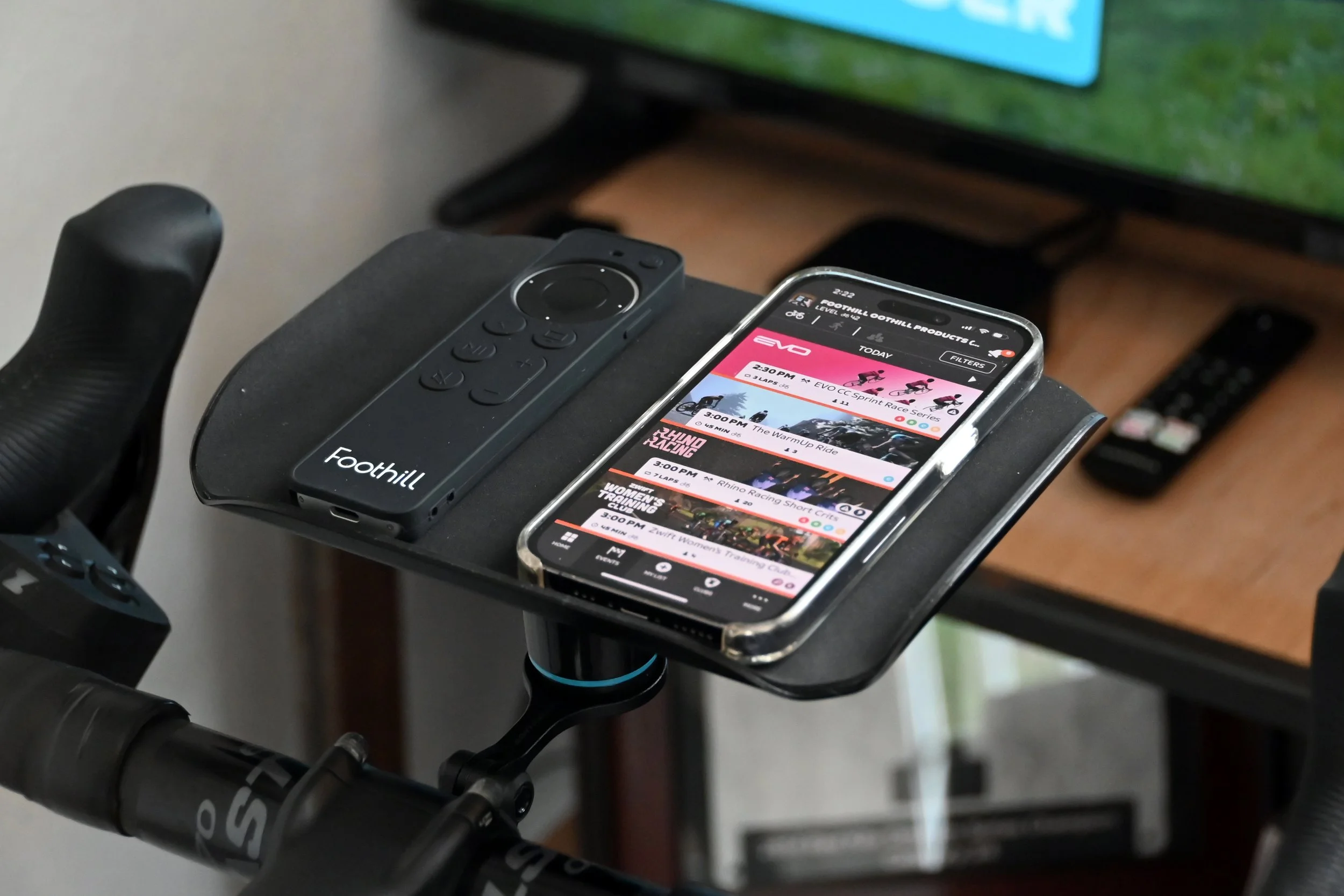 Foothillのトレーナートレイは、既存のコンピュータマウントを利用してハンドルに固定する。