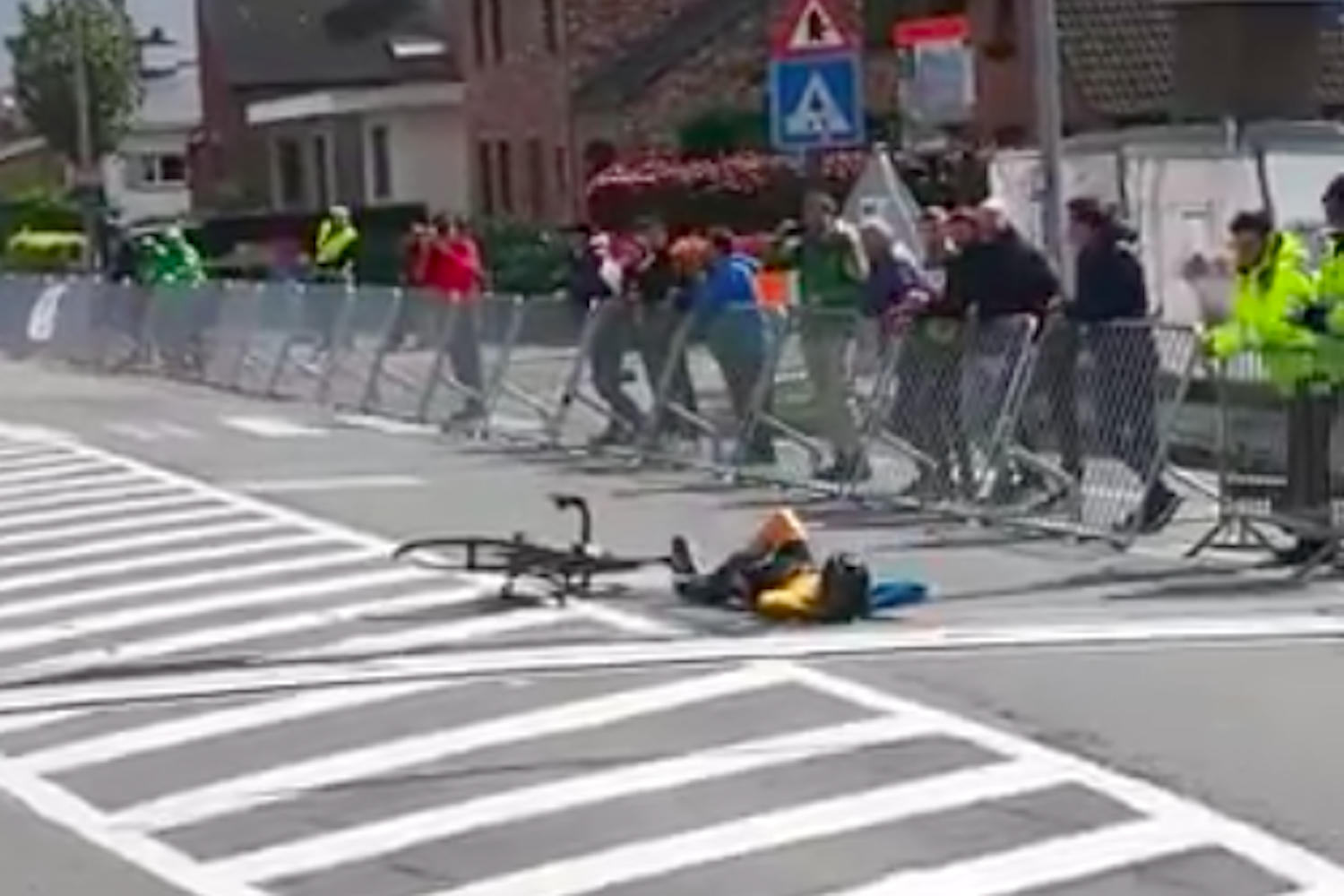 フィリップ・ジルベールは2017年のロンド・ファン・フラーンデレンのゴールで自転車を持ち上げてゴール!